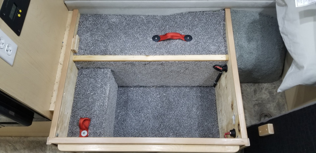 The final step was to add some trim where the carpet edges met. I estimate that I increased the storage space under the ottoman from 2 to 3 cubic feet. While I was in there, I moved the dual USB port to the front edge and installed a 12V outlet where the USB unit was. This project wasn't exactly easy, but I am very happy with the results.